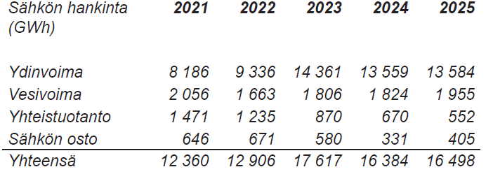 Vesivoiman osuus 2,0 (1,8) TWh oli 11,9 (11,1) prosenttia sähkön hankinnasta. Vesivoiman tuotanto nousi yli normaalin vesivuoden tuotantolukeman. Lämmön ja sähkön yhteistuotantolaitoksissa sähköä tuotettiin yhteensä 0,6 (0,7) TWh. Osuus kokonaishankinnasta oli 3,3 (4,1) prosenttia.
