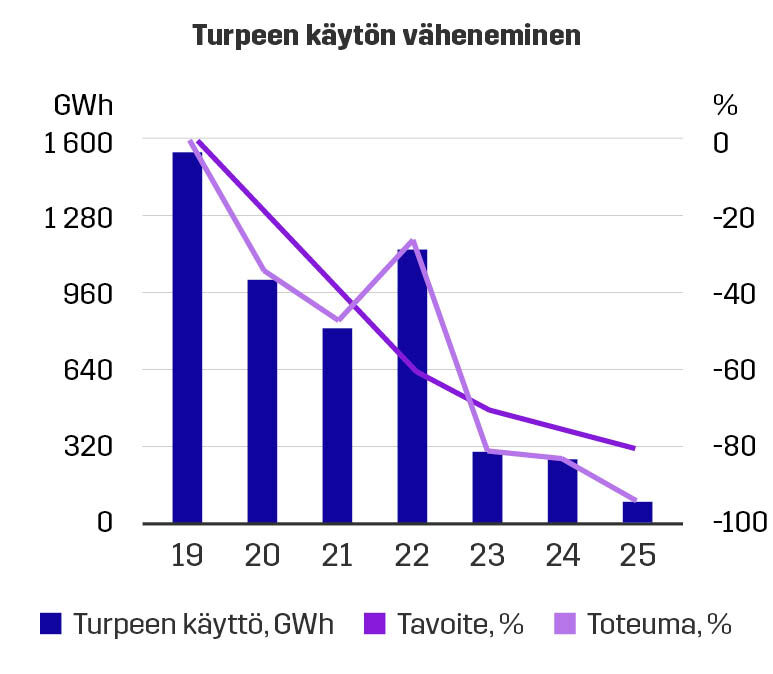 Tavoitteenamme oli, että vuonna 2025 olemme vähentäneet turpeen käyttömme 80 % vuoden 2019 tasosta. Vuonna 2025 saavutimme tavoitteemme, sillä turpeen käyttömme oli vähentynyt 94 % vuoden 2019 tasosta.