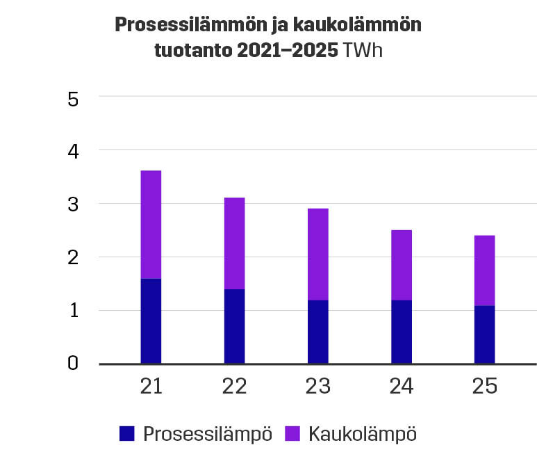 Vuonna 2025 yhteistuotantolaitostemme tuottivat lämpöä 2,4 TWh ja sähköä yhteensä 0,6 TWh. Meillä ei ole sähkön erillistuotantolaitoksia eli lauhdevoimalaitoksia.