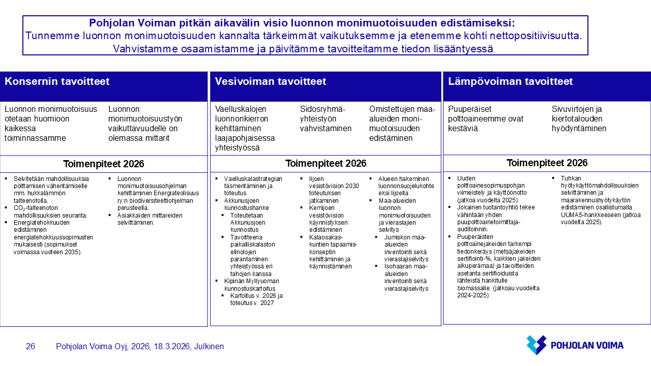 Luonnon monimuotoisuus on kirjattu strategiaamme. Vastuullisena toimijana yhteensovitamme kilpailukykyisen hiilidioksidineutraalin tuotannon ja luonnon monimuotoisuuden. Haluamme tuottaa vesivoimaa vastuullisesti ja hyödyntää yhteistuotannossamme kestävästi tuotettuja puupohjaisia polttoaineita.
