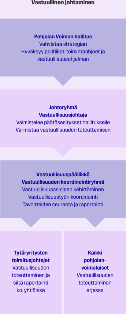 Vastuullisuuttamme ohjaavat kansainväliset periaatteet sekä Pohjolan Voiman hallituksen hyväksymä strategia, arvomme ja vuosittain päivitettävät vastuullisuuspolitiikat.