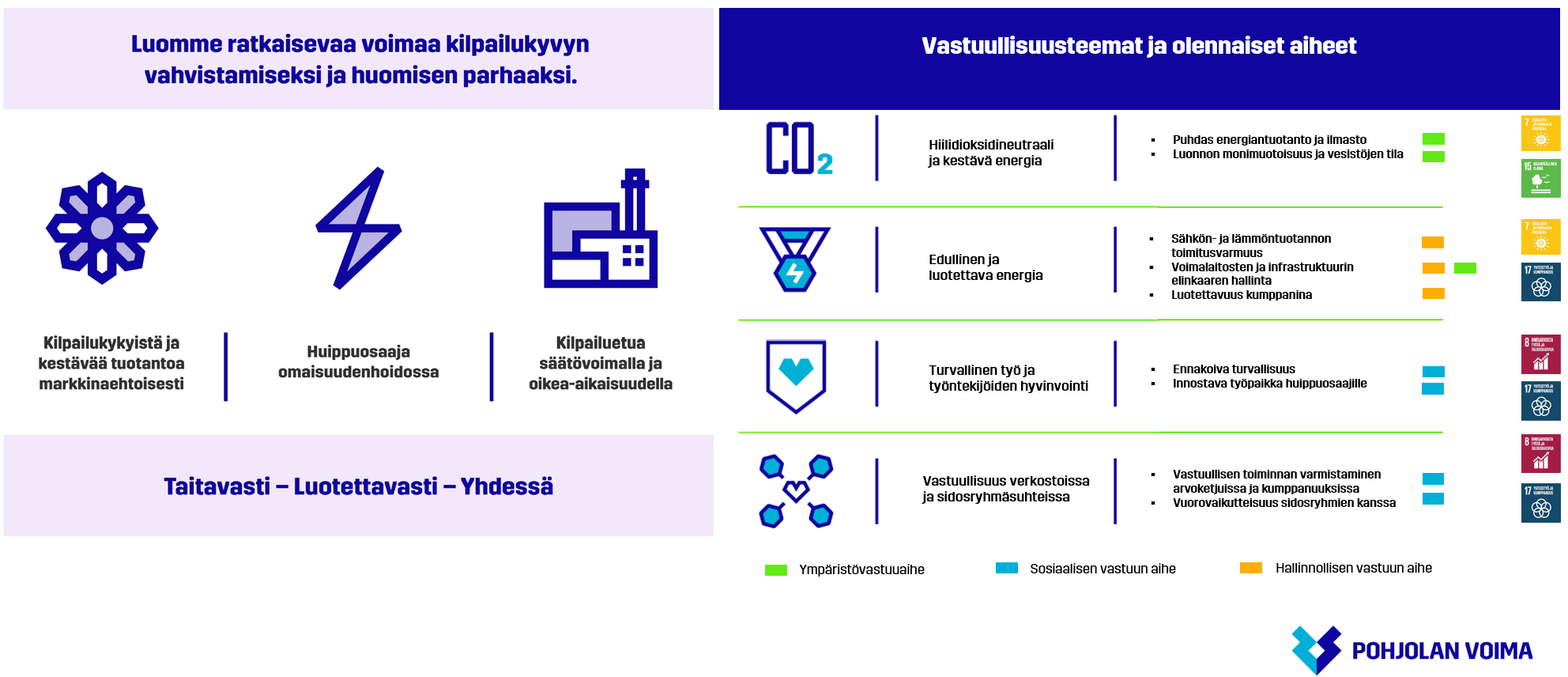 Vastuullisuutemme pohjana ovat toiminnalle olennaiset näkökohdat ja yhtiön arvot, taitavasti, luotettavasti ja yhdessä. Toimintaamme ohjaavat Pohjolan Voiman hallituksen hyväksymät vastuullisuuspolitiikat (liiketapapolitiikat, code of conduct).